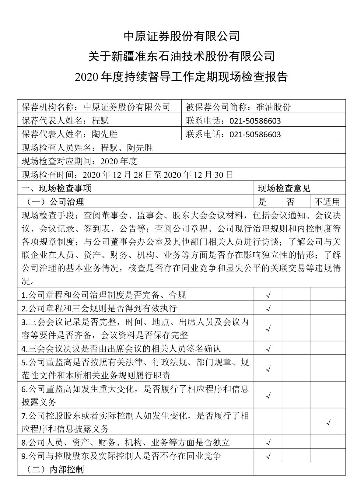 >> 中原證券關(guān)于準(zhǔn)油股份2020年度持續(xù)督導(dǎo)工作定期現(xiàn)場檢查報告