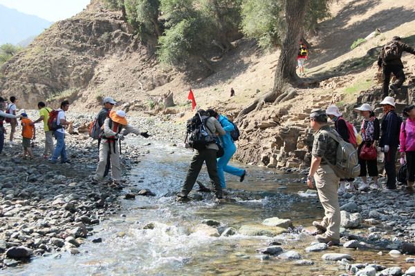 翻過一道山梁,車在獨(dú)山子村外面一塊寬闊地帶停下來,領(lǐng)隊將我們分成4個小組,推選了小組長,便于后面的行動。在做了準(zhǔn)備活動后,徒步開始。先進(jìn)水磨河,水磨河谷滿是鵝卵石,墊得腳發(fā)痛。溪水在河灘里繞來繞去,迫使我們經(jīng)常在溪水上跳來跳去。有些地方溪寬流急,得格外小心,掉到水里可不好受,去年在“四渡赤水”處就有人掉進(jìn)水里,徒步也就到此為止,鞋襪濕了,套在腳上冰涼,而且一走一滑,一會兒腳上就要打泡,于是不敢再走,今年可要吸取這個教訓(xùn)。這時,年輕人便伸出了援助的手,幫助年長的體弱的渡河,集體主義精神在這里大放光芒。