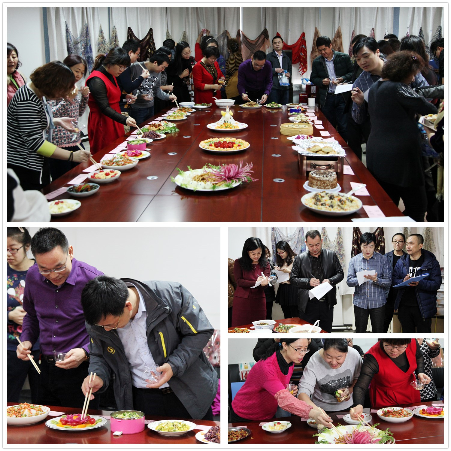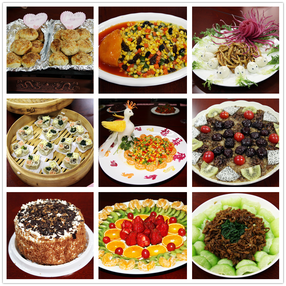 上午11時30分,公司第三會議室香味撲鼻,參加廚藝展示的美麗的"廚娘"們紛紛亮出四喜蒸餃、心中有數(shù)、糖醋魚條、奶油康斯、百花釀豆腐、麥穗魷魚卷、海米油菜、椒鹽蘑菇、焦燒變蛋、梅菜扣肉等豐盛營養(yǎng)、色香味俱全的菜肴,以及黃面烤肉、碎肉抓飯、私房水煎包、棗糕、八寶飯等主食面點,共計達(dá)35道菜品。
